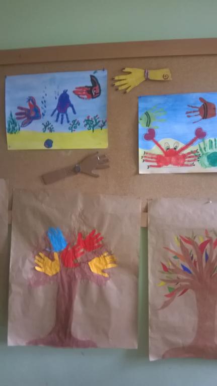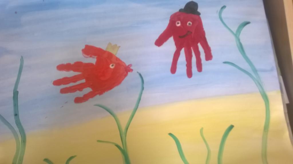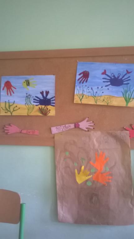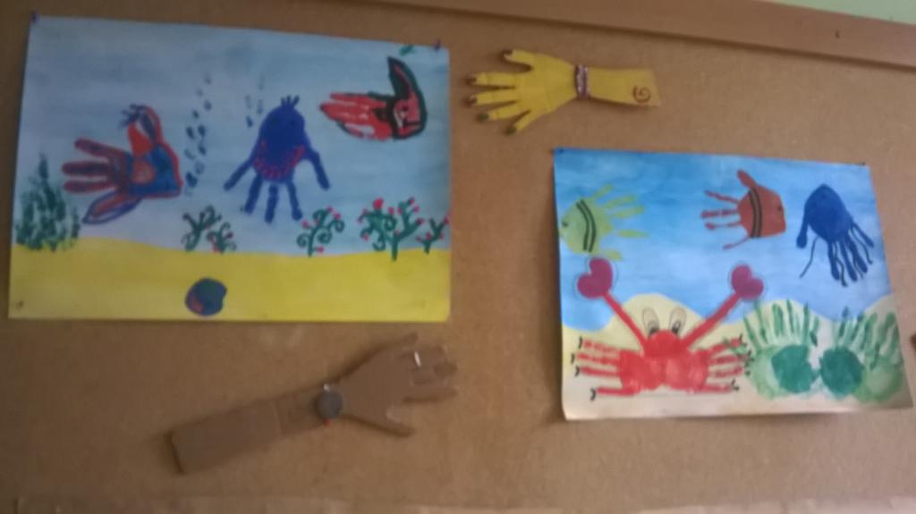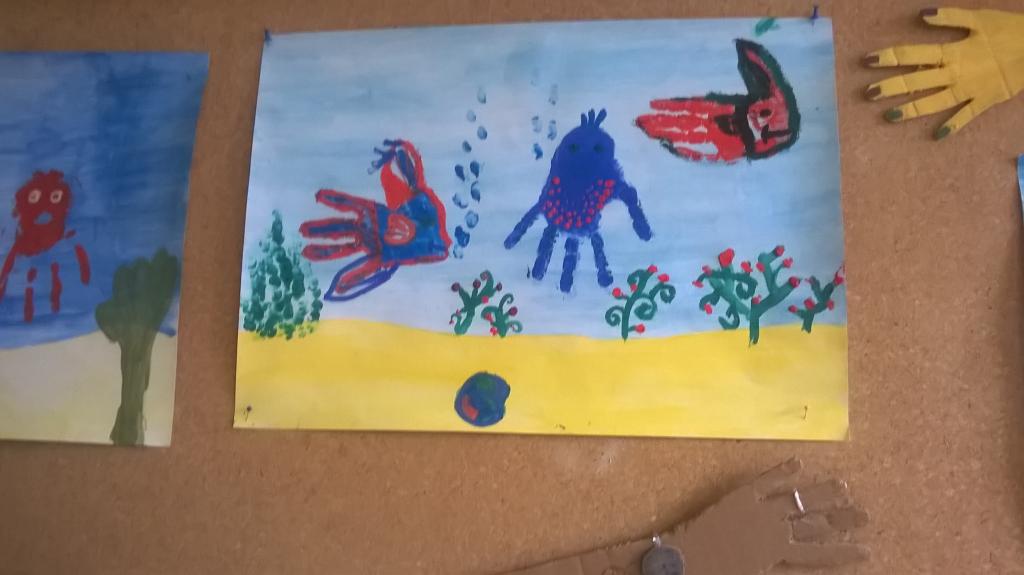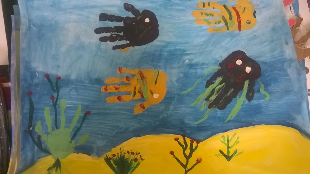 V rámci výtvarné výchovy jsme se dlouhodobě věnovali tématu, ve kterém jsme využívali naše ruce nebo tvar rukou. První týden jsme otiskovali dlaně na velký papír a tvary otisknutých barevných rukou sváděly k tomu, abychom je dále dotvořili a domalovali. Vznikly krásné podmořské výjevy, kde otisky rukou plavou jako ryby nebo chobotnice nebo ztvárňují mořské chaluhy. Sice žáci byli hodně zmazaní od barev, ale práci si velmi užili.