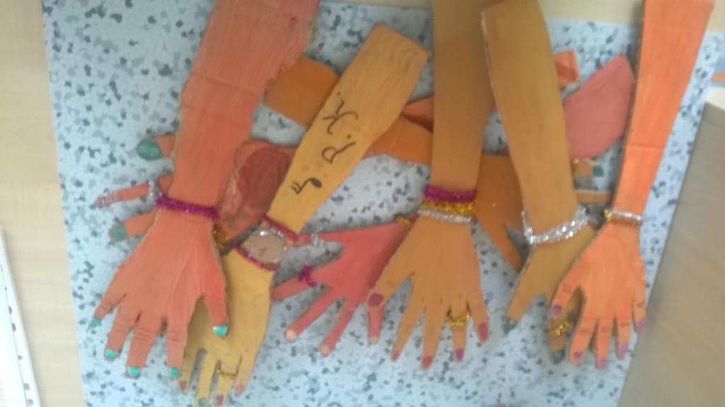 Druhý týden jsme vytvářeli paže z kartonu. Nalakovali jsme jim nehty, vytvořili krásné prsteny, náramky, hodinky a domalovali tetování.