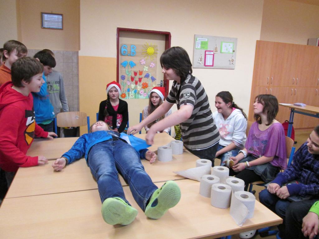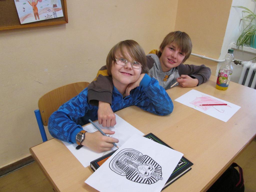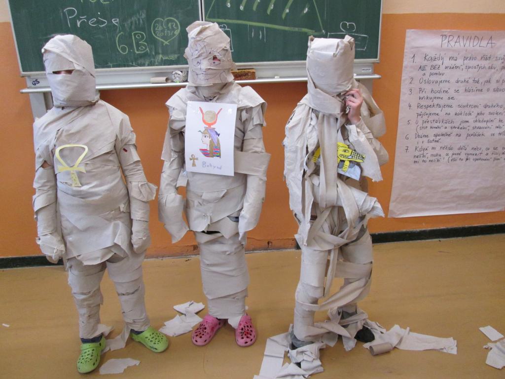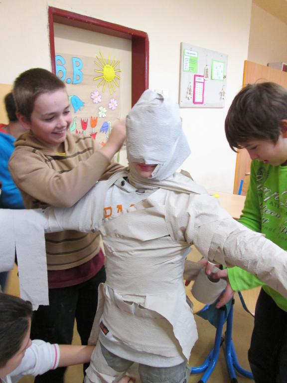 Při výtvarné výchově jsme se před Vánocemi proměnili ve staroegyptské umělce a vážené balzamovače. Nejdříve jsme vytvořili obrázky staroegyptských symbolů, bohů, pyramid, hieroglyfů aj. Po důkladném nastudování přípravy procesu balzamování jsme přeměnili třídu v dílnu balzamovačů a proměnili 3 těla v mumie. Na výsledky naší práce se můžete podívat v následující galerii.