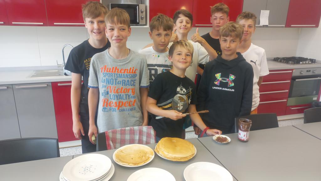 Žáci 7.A mne požádali, že na závěr školního roku by si chtěli usmažit v naší cvičné kuchyňce palačinky. Začátek jedné skupiny vypadal, že bude bez mléka... Vše se nakonec zvládlo a celá skupina si pochutnala smiley