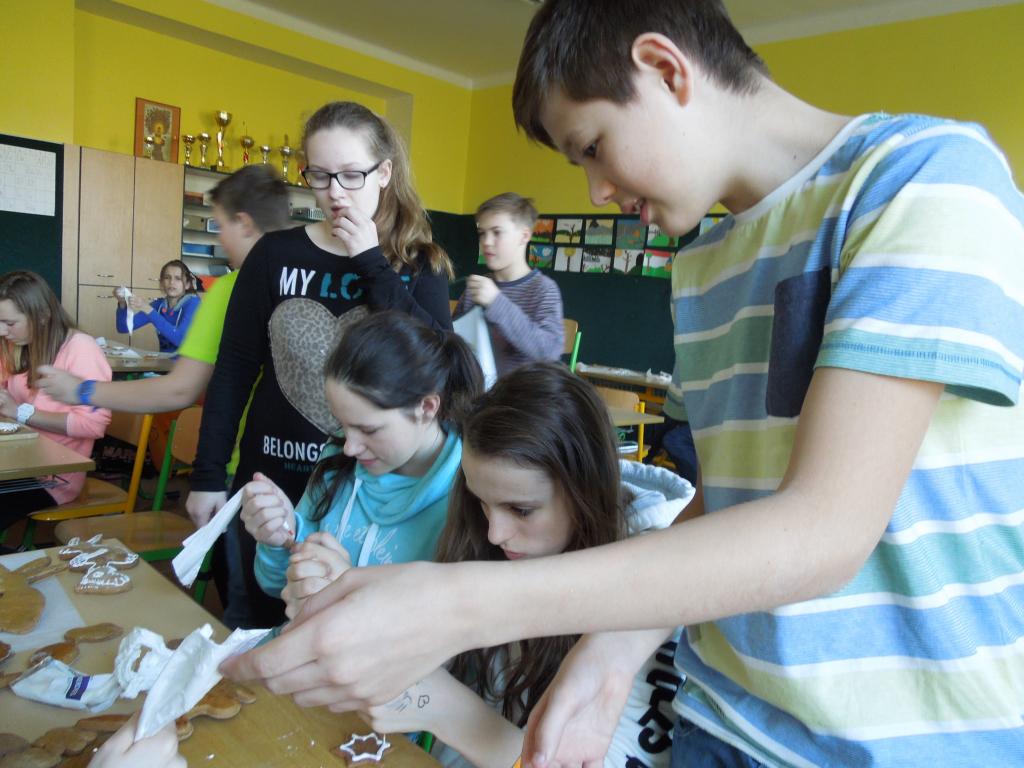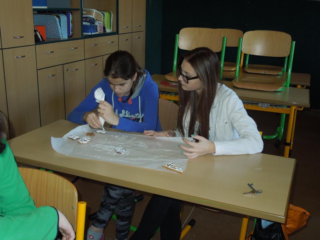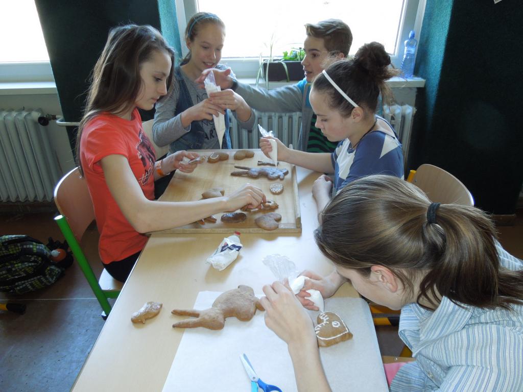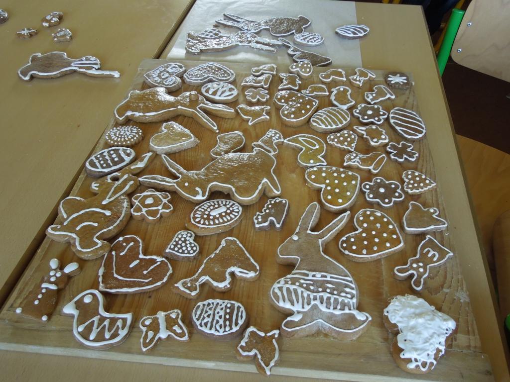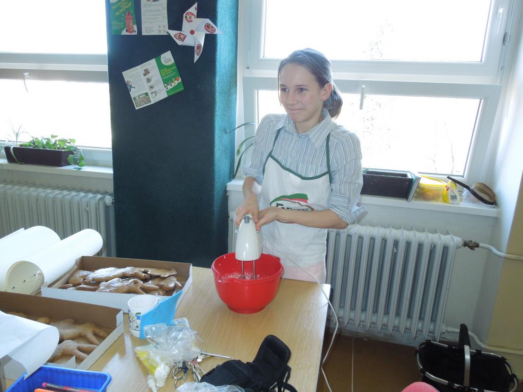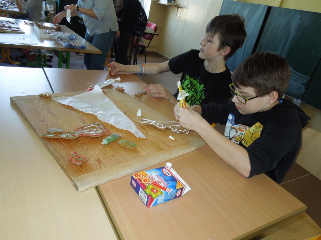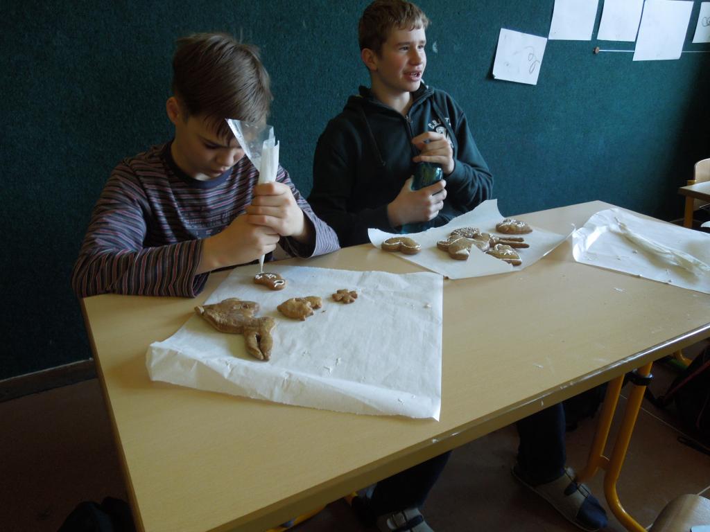 Před týdnem voněl ze školní kuchyňky pečený perník, o týden později ve třídě 7.A se zdobilo bílým sladkým sněhem. Šlehač pomalu nestačil vyrábět sníh pro nedočkavé "cukráře". Ten, kdo nezdobil, vyráběl plakát na velikonoční jarmark. Dopadlo vše výborně. Máme napečeno, ozdobeno, domluvíme prodejní ceny a můžeme 31.3. prodávat. Věříme, že dost prodáme a vydělanými korunkami pomůžeme.