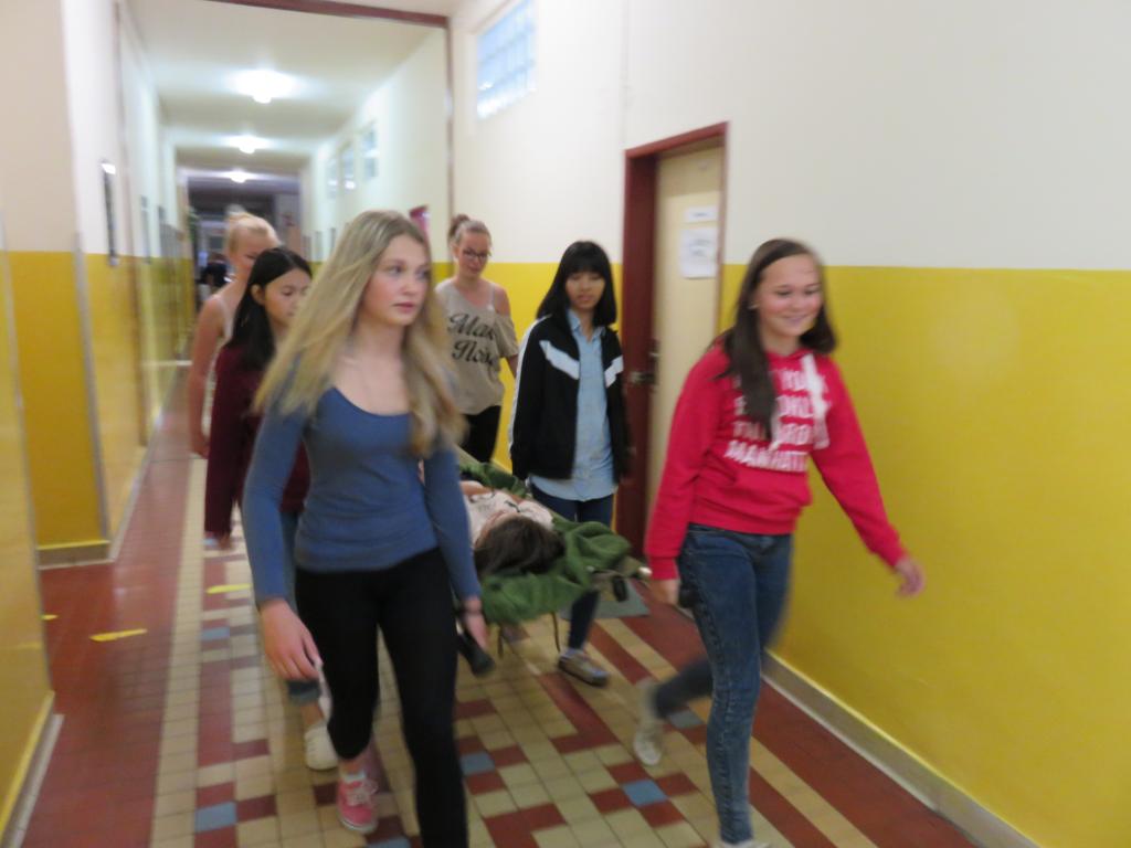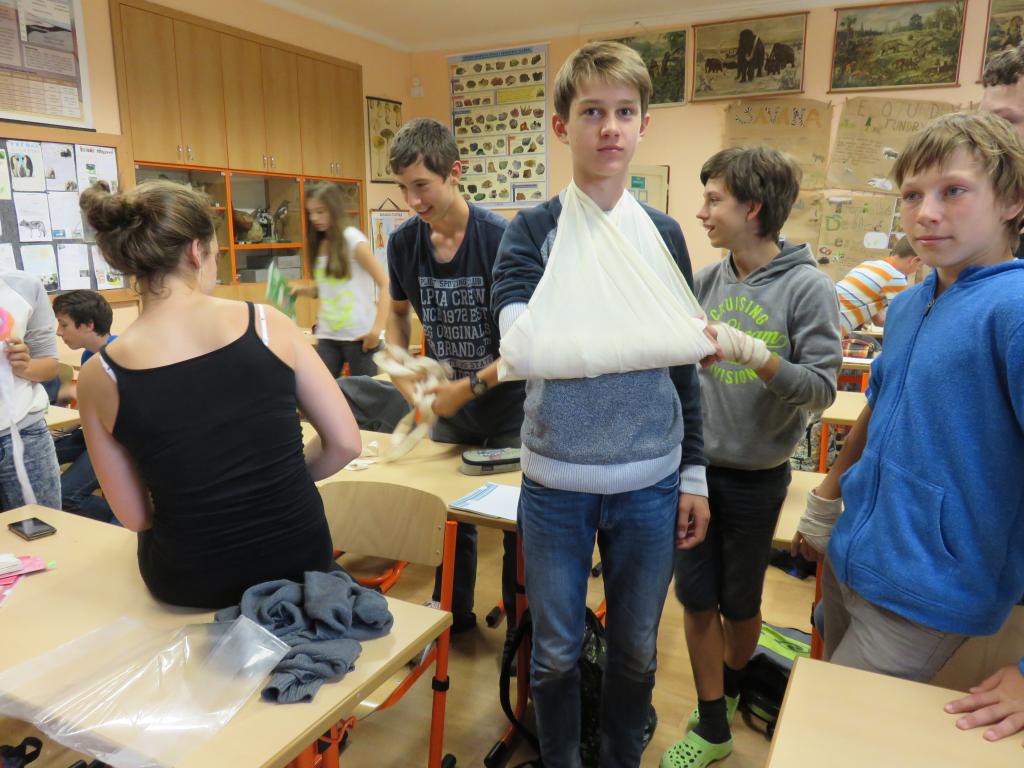 Zkusili jsme si přenášet raněné a nebylo to vždy jednoduché. Obvazová technika nám šla docela dobře, můžete se přesvědčit na přiložených fotkách.