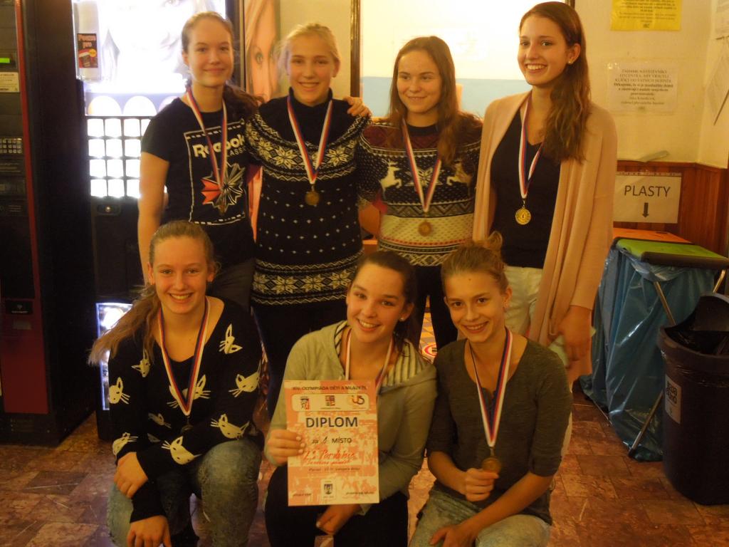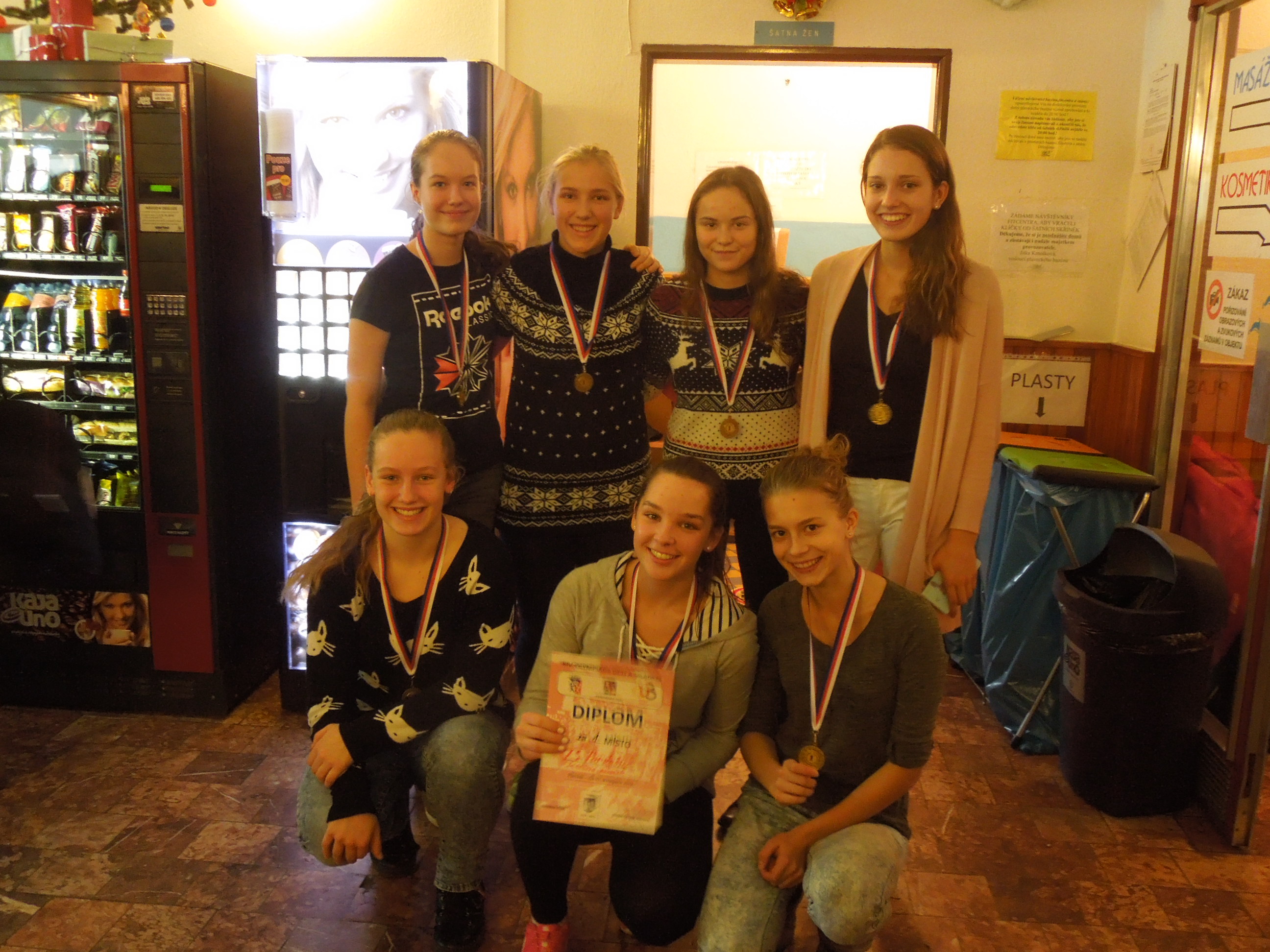 V úterý 8. prosince odjížděli brzo ráno vítězové okresního kola v plavání na kolo krajské do Poličky.Byl nás plný autobus a každé družstvo bylo zvědavé, jaký neznámý soupeř na ně čeká v 25m bazénu v Poličce. Děvčata čekala 4 x 25m polohová štafeta ( znak, prsa, motýlek a volný způsob), individuální závod 50m ( znak, prsa, volný způsob a 25m motýlek) a závěrečná štafeta 6 x 50m volný způsob. Napnuté to bylo až do úplného závěru soutěže. I v oslabené sestavě se nám podařilo z vody bazénu vylovit ten nejcennější kov. Zlaté medaile za nádherný a bojovný výkon patří Kateřině Burianové, Barče Štíkové, Lucce Miřejovské, Adéle Macounové, Lence Bartůňkové, Elišce Novotné a náhradnici Anetě Jedličkové.