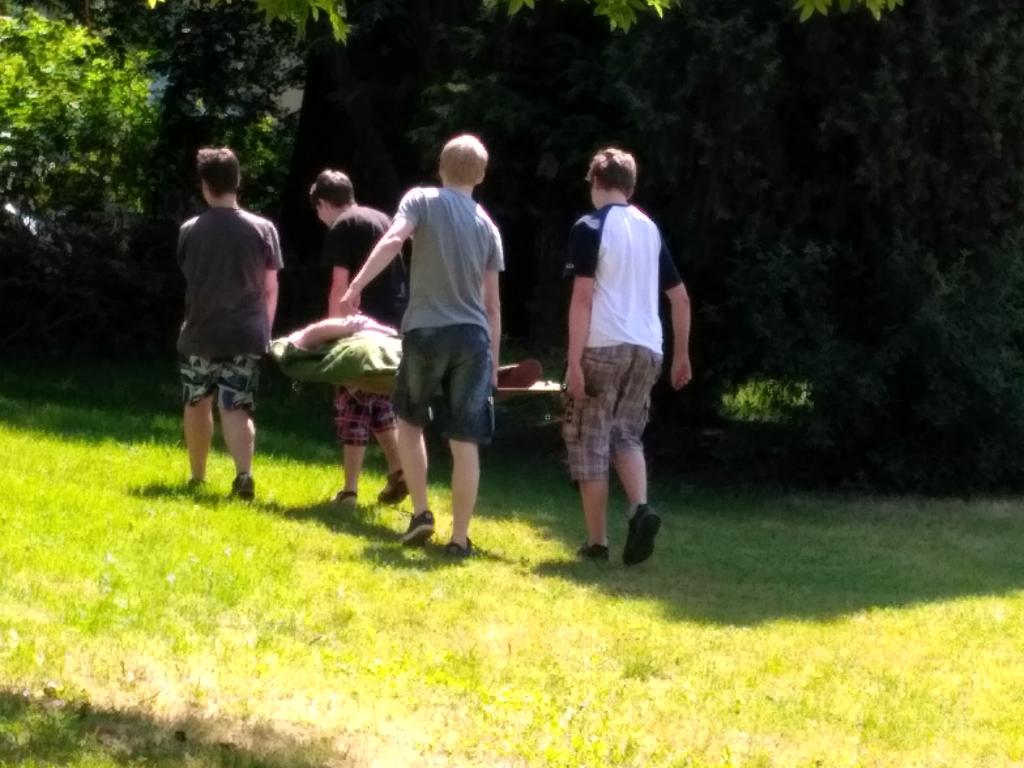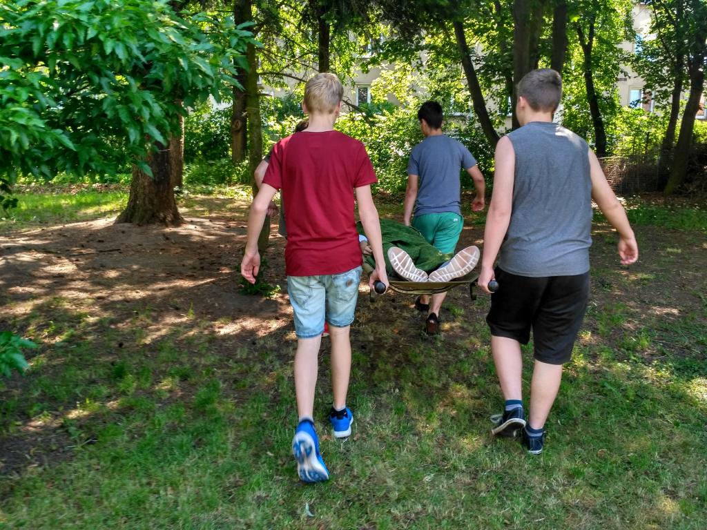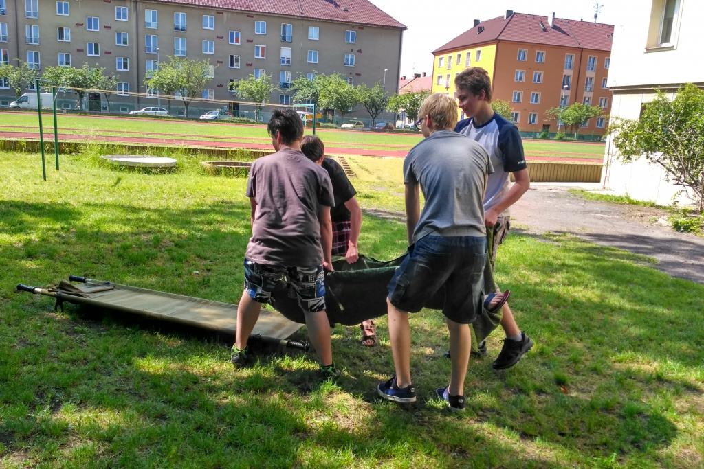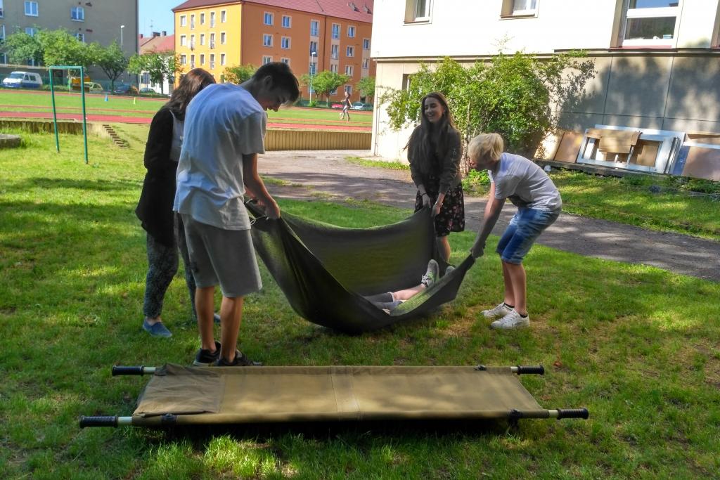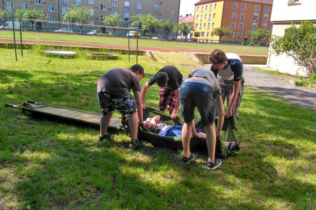 Není od věci některé teorie ověřit v praxi. Transport raněných jsme si už zkusili při projektovém dnu o mimořádných událostech. Ale nést člověka na nosítkách celých 200m, je zkušenost zcela jiná, namahavější, bolestivější, odpovědnější a vyčerpávající. Modelou situaci jsme zvládli a žádného raněného jsme nevyklopili. V reálném životě si budeme přát, abychom takovou situaci nemuseli řešit, úrazům budeme předcházet a pokud přesto něco takového zažijeme, tak máme natrénováno.