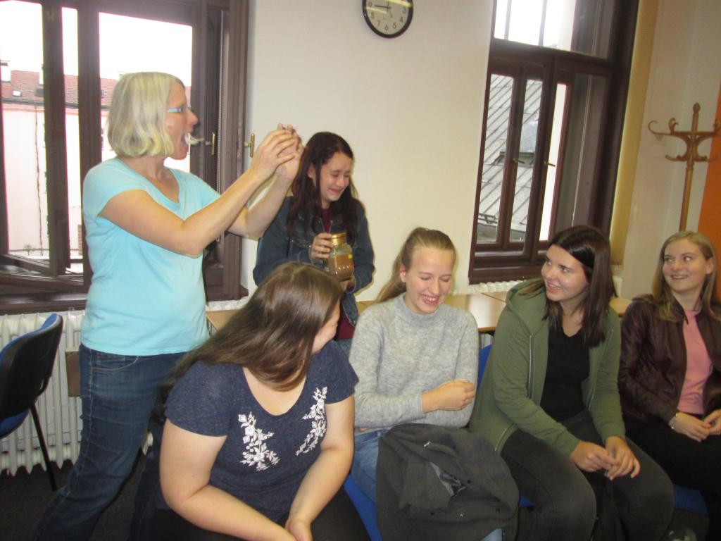 V češtině se jednalo o rébusy s příslovími a např. soutěž o co nejdelší větu složenou ze slov začínajících stejným počátečním písmenem, při které zazářily Emilka (27 slov!) a Vendulka. Iveta famózně reprodukovala v portugalštině sousloví hráč fotbalu = jogador de futebol. Rodilá mluvčí Macarena okouzlila španělštinou Natku, Lucku a Týnu s Anetou. V British council nejvíce nadchlo rozsvícení světýlek =), ale samozřejmě i správné řešení křížovek, což bylo snadné pro Barču. Johanka s Viki se popraly s dominem, Elda s Míšou zabojovaly nejprve u kvízu a poté u vlajek. V Goethe-Zentru se i neněmčinářky naučily základní fráze (s výbuchy smíchu) a zjistily, že němčina a čeština má spoustu podobných slov, ale ne vždy se stejným významem. I nesmělá Pája odcházela nejen s povznesenou náladou, ale také se sladkou odměnou pro tým, který uspěl v soutěžích. Poslední zastávkou byla Alliance francaise se stanicemi s pařížskými památkami a závěrečnou hrou "Šibenice" se základními francouzskými frázemi, kde se projevila sečtělost Aničky a zkušenosti Viki s francouštinou.