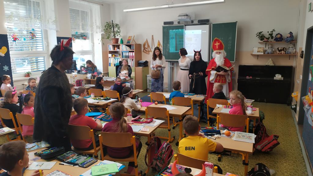Na začátku prosince navštěvuje děti Mikuláš s anděly a čerty. Této úlohy se s chutí ujali Zuzka, Eliška, Lea, Denisa a Andrej (dokonce si ji "vybojovali=vykomunikovali" mezi uchazeči z devátých ročníků).