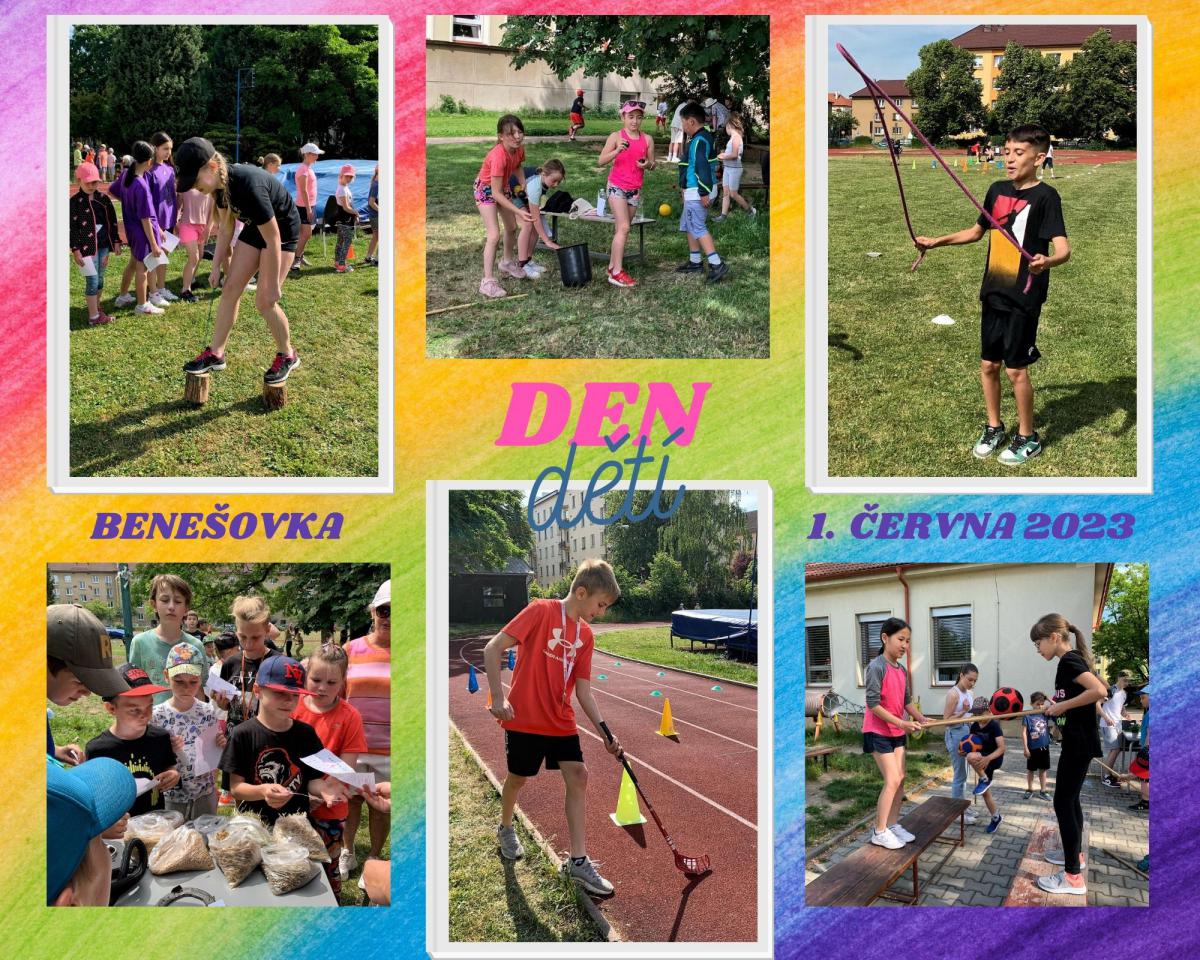 Na Benešovce jsme Den dětí slavili také. Letošní organizaci měla na starost třída 9.B pod vedením paní učitelky Lenky Klepalové a paní asistentky Pavlíny Jezdinské. Deváťáci si pečlivě připravili celkem patnáct různorodých stanovišť. Nechybělo tradiční skákání v pytli, balancování s míčkem, opičí dráha, hod na cíl ... Mezi ty neobvyklé patřilo poznávání plodin, Kimova hra nebo chůze na špalcích. Zatím co děti z prvního stupně běhaly od stanoviště ke stanovišti a užívaly si zábavu, od jejich starších spolužáků se očekávala velká dávka trpělivosti a empatie. Vše zvládli na výbornou a patří jim za to dík.