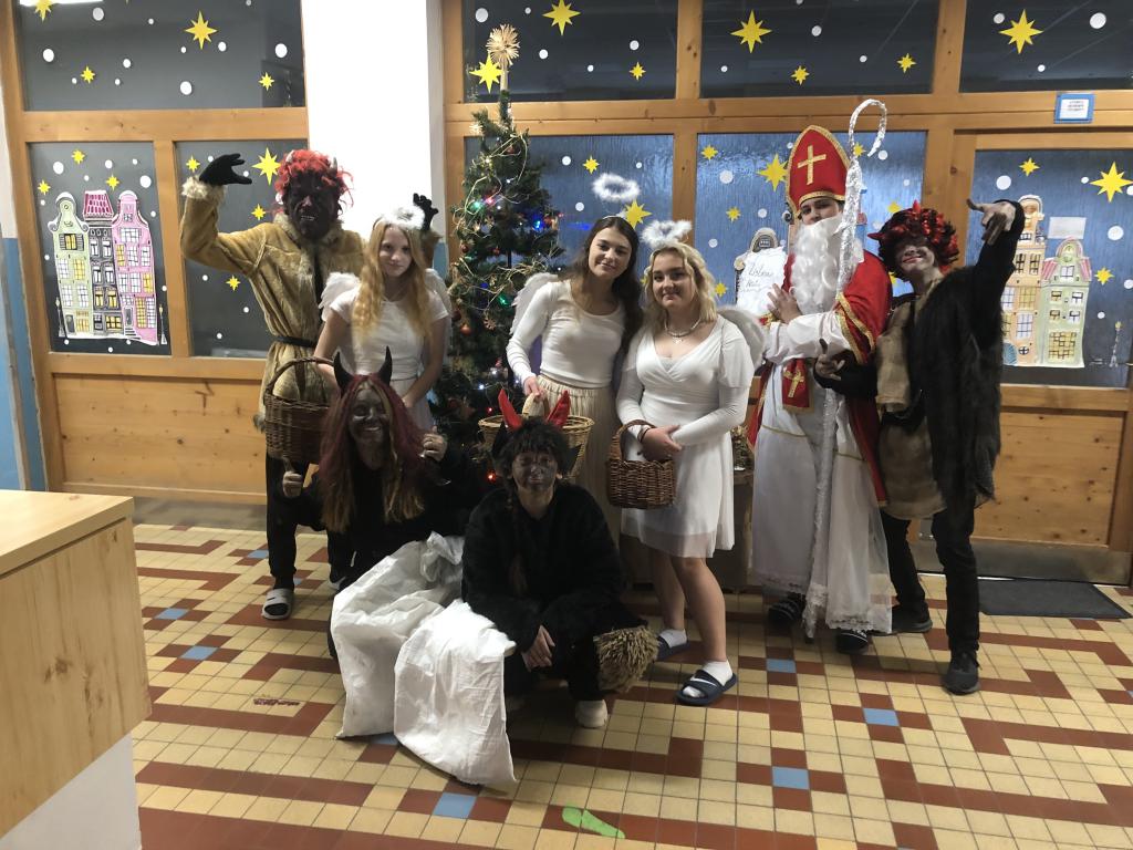 Velká skupina čertů, andělů a Mikuláše v podání žáků 9.B vyrazila pobavit, postrašit, ale i překvapit své mladší spolužáky z prvních, druhých, třetích a čtvrtých ročníků.