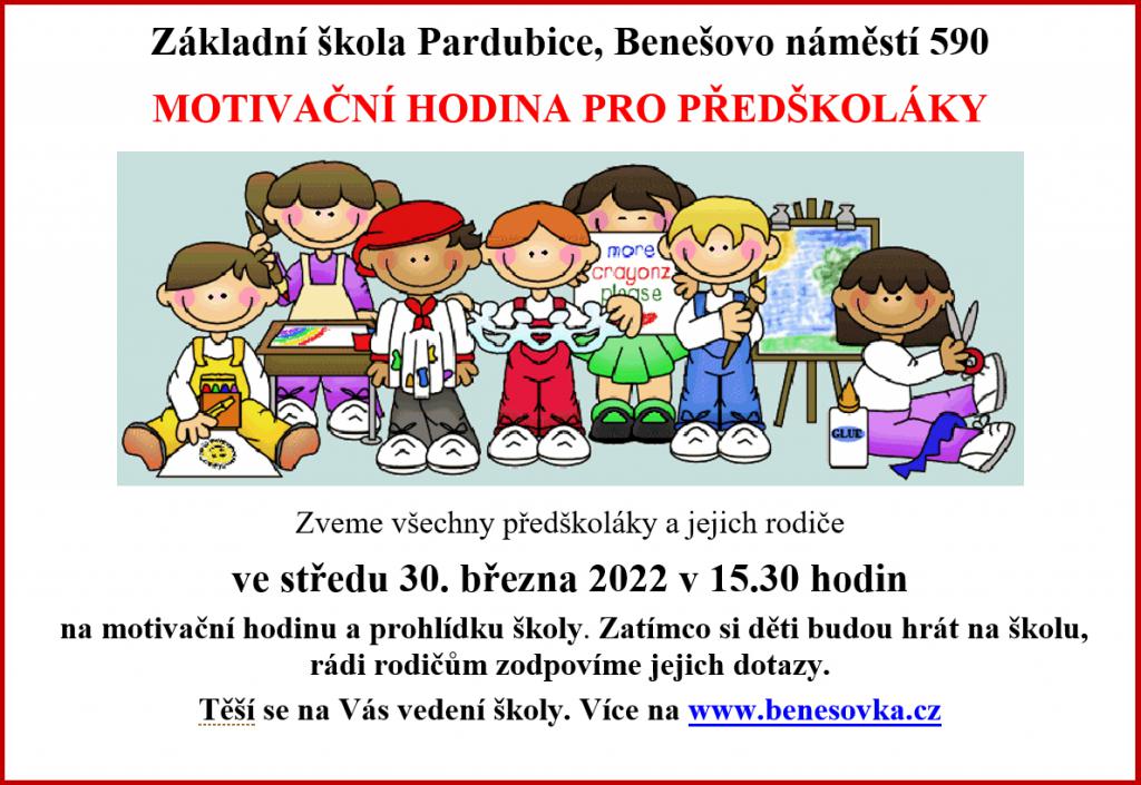 Zveme předškoláky a jejich rodiče ve středu 30. 3. 2022 v 15.30 na motivační hodinu pro děti a prohlídku školy.