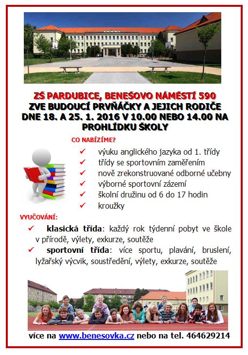 Základní škola Pardubice, Benešovo náměstí 590 otevírá dveře pro budoucí prvňáčky. Přijďte se svými dětmi k nám do školy. Můžete se seznámit s prostředím školy ještě před zápisem, který je čeká dne 10. a 11. 2. 2016. V dopoledních hodinách můžete nahlédnout do výuky, odpoledne si můžete prohlédnout školu. Všechny vaše dotazy rádi zodpovíme. Těšíme se na Vás. Prohlídka školy je možná v pondělí 18. nebo 25. ledna 2016 v 10 hodin nebo ve 14 hodin.