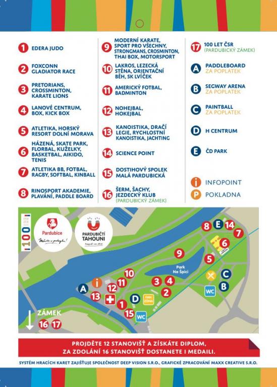 po loňském úspěšném Sportovním parku v Pardubicích bude Magistrát města Pardubice pořádat od 11. – 19. srpna 2018 Sportovní park Pardubice v lokalitě Park Na Špici I a II, Zámek Pardubice znovu. Otevírací doba parku je 9.00 – 18.00 hod.