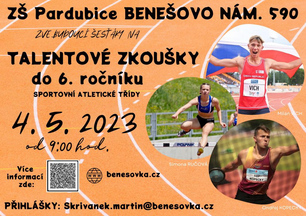 S jarním obdobím nejsou spojeny jen zápisy budoucích prvňáčků a přijímací zkoušky deváťáků. V květnu se na Benešovce také tradičně konají talentové zkoušky do 6. ročníku sportovní atletické třídy. Rádi bychom pozvali budoucí šesťáky, kteří mají zájem o sport a chtějí se věnovat atletice, na "talentovky" i letos.