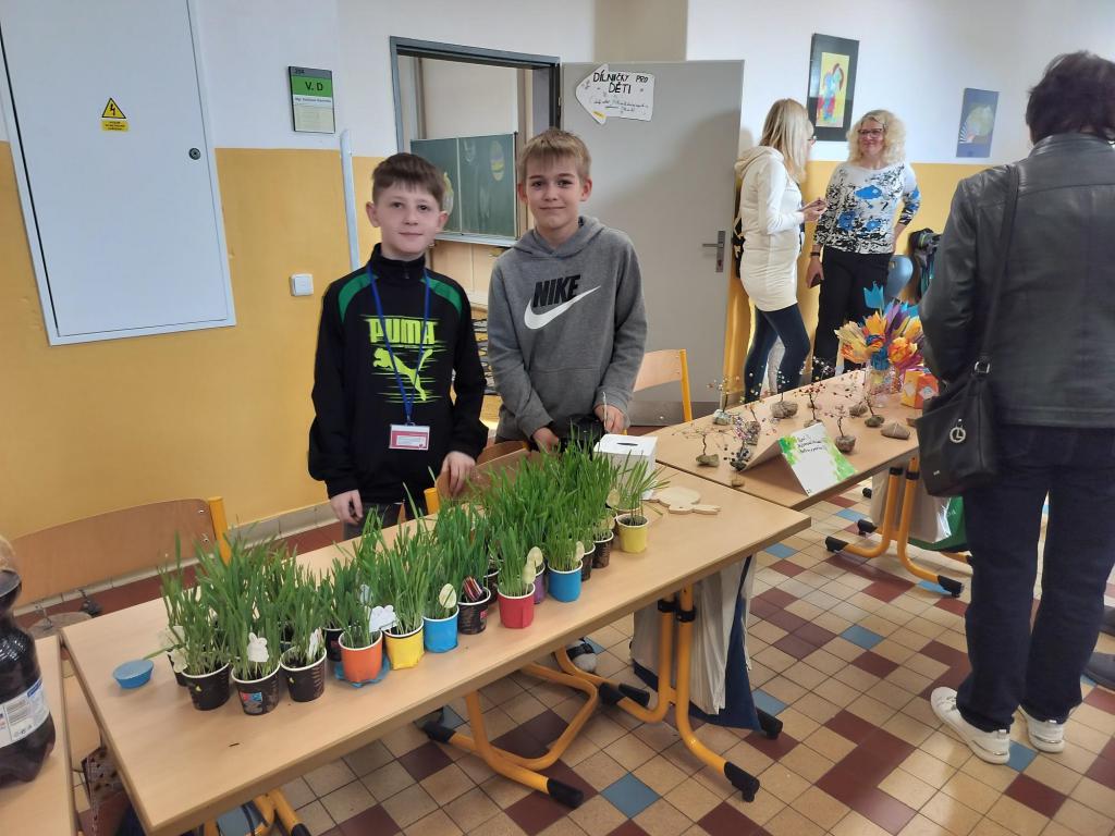 Duch jara prostoupil celým prostorem. Škola doslova rozkvetla. Chodby hrály pestrobarevnými barvami v podobě žákovských výrobků s velikonoční tematikou. Samožřejmě všemu předcházela poctivá příprava a výroba, každý přiložil ruku k dílu - žáci, učitelé, rodiče i prarodiče. A že letos bylo opravdu z čeho vybírat! Návštěvníci si mohli s sebou odnést ozdobené osení se zápichy, roztomilé patworkové slípky či zajíčky, stromky z korálků, velikonoční věnce, pomlázku, krásně zdobené perníčky, malovaná vajíčka a mnoho dalšího. Kdo měl chuť tvořit, mohl si vyzkoušet výrobu ovečky z vlny a papírového kuřátka nebo si mohl originálně nazdobit vlastní perníček v dílničkách. Na své si přišly i mlsné jazýčky. Mufinky, věnečky, perníčky, bábovky, pečení beránci a jiné dobroty byli lahodným občerstvením při nákupu. Kdo nerad sladké, nemusel zoufat, mohl si posloužit trochou popcornu či vynikajícím miniburgerem. K pití se rozlévala osvěžující limonáda.